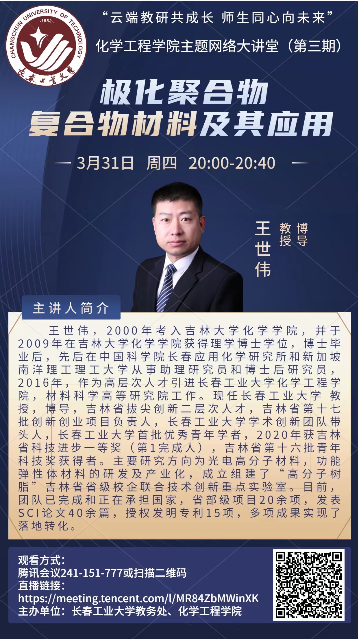 为增强战胜疫情的信心,缓解学生的焦虑情绪,丰富学术和文化生活,由教务处和yl6809永利官网集团主办,面向在校本科生和研究生推出“云端教研共成长 师生同心向未来”yl6809永利官网集团主题网络大讲堂系列活动。每期邀请一位主讲嘉宾在腾讯会议线上进行报告(报告30分钟,讨论10分钟),以学术报告、教研讲座、思政讲座、科普讲座等形式与同学们深入交流,为同学们带来人文关怀与学术素养熏陶。第一期定于3月27日(星期日)晚18:00举行,第二期于3月29日(星期二)晚20:00举行,之后会陆续发布系列报告时间,具体信息见海报,欢迎大家观看直播。