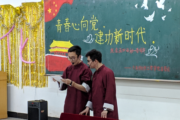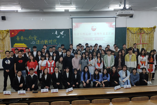 新闻网讯(通讯员梁译丹 李紫嘉)为纪念五四运动100周年,弘扬五四爱国精神。yl6809永利官网集团团委5月4在北湖校区西阶102举行“青春心向党,建功新时代”主题文艺汇演。校团委会常务学生副书记付中礼、校学生会秘书长巨盟池、校社团联合会副主席周雨晴,学院十届三任团委副书记万义、学院主要团学干部及2018级全体同学参加了本次汇演。2018级申沛航、郭芯潼担任主持。
