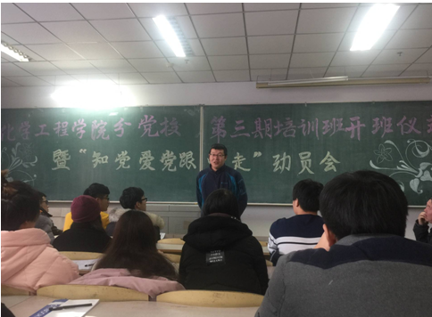 学院党委书记刘喜明为第三期入党积极分子作了“知党爱党跟党走”动员会。动员会上,刘书记指出当代大学生不仅要接受一系列的学校、学院技能培养,更要知党爱党跟党走。当代的所有经济、文化都是在政治掩盖下所进行的,所以学好政治,不仅是当代大学生的义务也是责任。党的领导宗旨在于全心全意为人民服务,当代大学生应保持积极为他人服务的尽头,从而带动身边更多的人。一名优秀的党员,还要明确“两学一做”的要领,要认真学习党史党章,通过党在不同时代的工作方针,结合其工作理念不断努力,努力成为社会主义接班人。