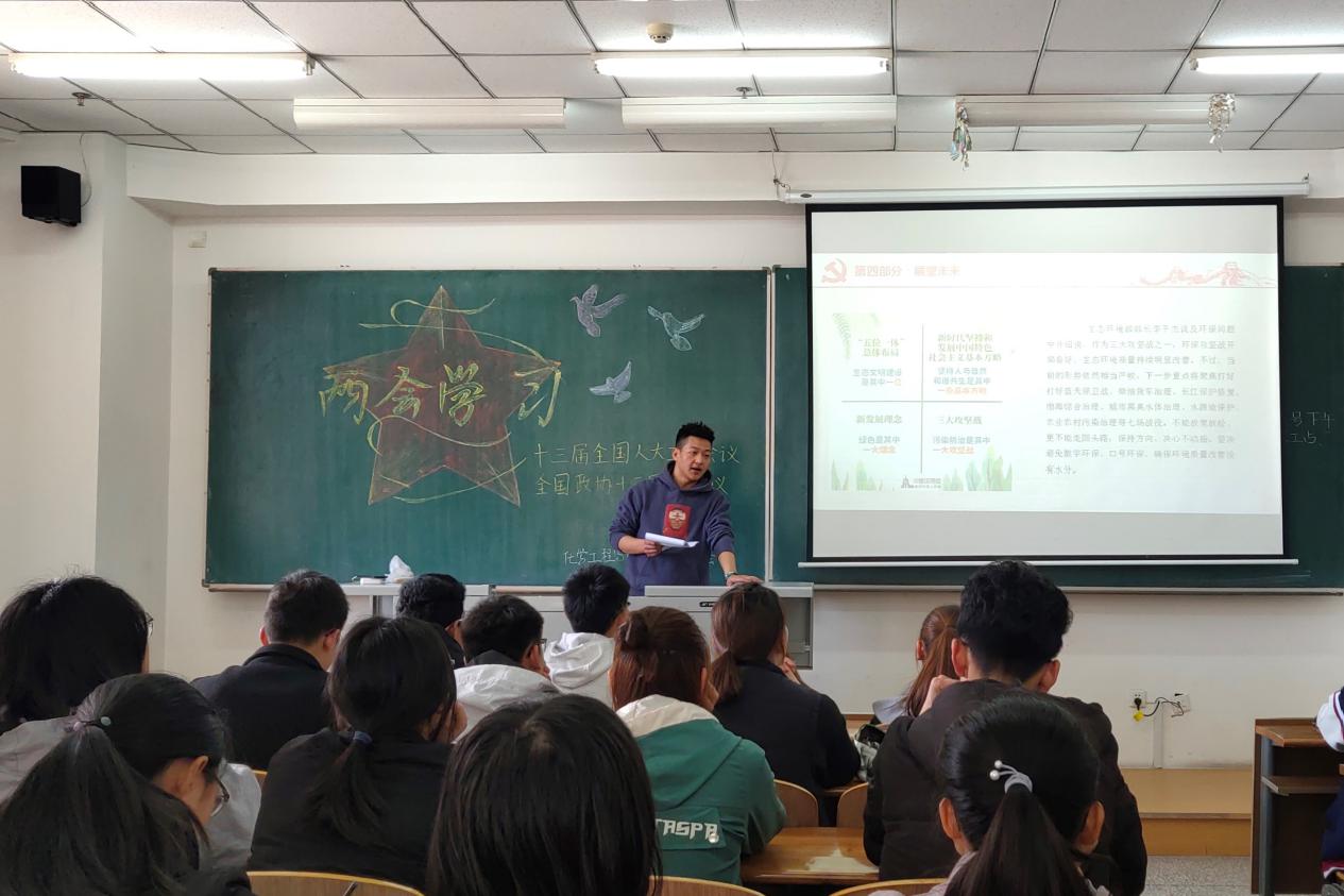 会上,包英健从全国两会的介绍和会议议程对今年全国两会作了细致地解读。随后,同学们共同学习了李克强总理的政府工作报告并就教育、医疗等民生热点问题进行讨论发言。大家表示新时代有新发展,新时代有新展望,青年人要牢记党的伟大使命,争当时代新人。最后,学院团委副书记王俊皓对本次学习进行总结,他强调同学们要坚持党的正确领导,担当尽责,不辱使命,认真领会党的十九大和全国两会精神,做好社会主义的合格建设者和可靠接班人。