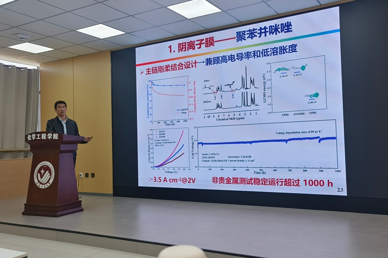 报告会上,焉晓明教授结合自身团队的最新研究成果,紧紧围绕高性能阴离子膜和阳离子膜的设计,提出了采用刚性结构、联苯结构及含醚结构等形式的主链结构,并围绕其进行功能化改性,实现了离子膜高传导率和低溶胀度的性能突破,并以此为基础,开展了产学研工程化放大研究,为在场师生搭建了理论与应用衔接的桥梁。